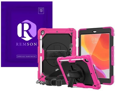 Remson Apple iPad 10.2 (2019) Rugged Shockproof Drop Protection With 360 Rotating Kickstand/Shoulder Strap Cover (Rose)