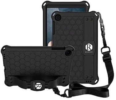 Remson Honeycomb Design Shockproof Case With Holder, Stand And Shoulder Straps For Samsung Galaxy Tab A 8.0 T290 And T295, Heavy Duty Stand Holder Case Cover With Strap (Black)