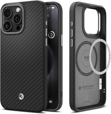 Spigen Enzo Aramid MagFit case for Apple iPhone 15 Pro is cut from the same cloth as bulletproof armor. The Aerocore Aramid Fiber material's lightweight protection keeps your iPhone standing up after taking shot after shot. Sleekly embedded with anodized aluminum accents and innovative MagFit Tech for powerful compatible with MagSafe connectivity.