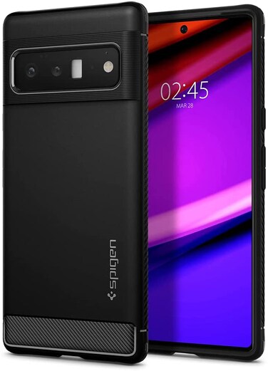 Spigen RUGGED ARMOR Case for the Google Pixel 6 PRO packs a whole lot of style and embodies the definition of slim protection. It is a flexible TPU case packed with heavy duty protection. The Rugged Armor series still remains a fan favorite for the amount of style and protection packed in a single layer. Its signature matte black with carbon fiber details are timeless but also prepared for impact in case of drops and falls. A new addition is a Carved Stripe Pattern for Steady Grip. Every corner is guarded with Spigen Patented Air Cushion Technology while edges are raised to protect the screen and camera. Precise cutouts provide easy access to features with zero delay while tactile buttons ensure haptic feedback.