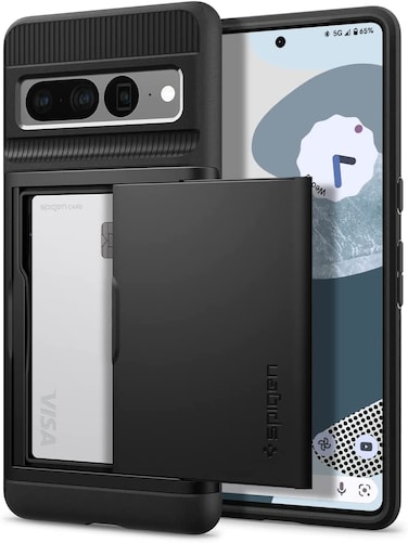Spigen Slim Armor CS case for the Google Pixel 7 PRO is built with dual layers to combat drops while concealing up to 2 cards or cash. A sliding door allows easy access without the problem of having open security issues. The dual layer of a shock absorbing TPU interior and a polycarbonate exterior keeps your device protected. Each corner is furnished with Air Cushion Technology allowing Advanced Shock Absorption to protect against shock that is dispersed throughout the interior TPU in case of external impact. Cutouts allow all features to be easily accessible. The edges ergonomically curve to provide the for the hand and preserve the feel of having the phone in its original form. Shock-proof, slim, and strong, the Slim Armor CS protects not only your device but also your shopping essentials.