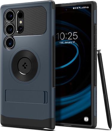 Spigen Slim Armor MagFit case conditions your Samsung Galaxy S24 ULTRA to be in its best-case scenario. Crafted with contoured edges for a comfortable hold, robust built-in magnets for seamless MagSafe compatibility, and a seamless Kickstand equipped with Active Stop technology, offering versatile hands-free viewing angles in both Portrait and Landscape orientations. Comprising three distinct layers: Impact Foam, which efficiently absorbs and disperses shocks through Spigen's patented Air Cushion Technology at all four corners, and a rugged Polycarbonate exterior that not only withstands extreme conditions but also shields its inner layers from impact. The outcome: An exceptionally fortified case that delivers top-notch defense while maintaining a slim and ergonomic profile.