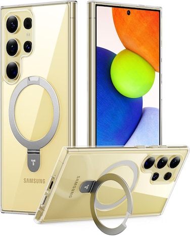 • About this item 【All in One: Magnetic, Stand, Ring Holder】It is compatible with MagSafe and a stand that doubles as a ring holder. What's not to like? As a magnet, it helps my galaxy s24 ultra phone case tightly attach to Magnetic accessories, even metal surfaces. As a stand, the best partner of your S-pen for drawing or remote control, it holds my phone upright or sideways for Facetime, video chat. As a phone ring holder, I can hold the ring with one finger to grip the phone securely when I get my hands full! 【Compatible with MagSafe Accessories & Wireless charging】What makes it stand out from the crowd? The ring holder not only doubles as a stand but also as a magnet. Therefore, it can securely attach to my MagSafe accessories such as a magnetic charging bank, magnetic car mount, magnetic wallet, magnetic charger, etc. Besides, it is also wireless charging compatible and helps my phone quickly align to wireless charging coils and chargers other devices like earphones with PowerShare! 【Millitary Grade Drop Protection】TORRAS takes the upgraded design to protect all corners. The screen lips rise 1.2mm and the camera edges lift 1.2mm. What‘s Exclusive, TORRAS incorporated a 360° Air cushion into the insides of the camera. It protects the Samsung s24 ultra case sufficiently from all drops, collisions, and shocks without any damage. It efficiently offers fumble, bumble, and tumble resistance. 【Perfectly Match, Comfortable Grip, Premium Texture】The little bevels on the ports and S-pen slot are at the perfect angles and heights. It works well with all screen or camera protectors. Besides, the strong rubber edges have a pleasing dimpled grip texture on the sides to keep it easy to hold, while the back is soft and smooth to touch. It feels sturdy but not at all bulky, so I can easily get it in and out of my pocket in the front.