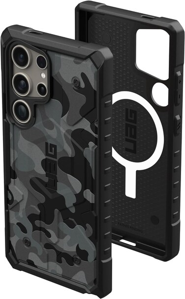 UAG (Urban Armor Gear) Pathfinder SE Pro MagSafe compatible case for Samsung Galaxy S24 ULTRA blends in while standing out and is the perfect companion for action and adventure. Wrapped in a camouflage design and multiple rivets give your device a unique look. Featuring an ultra-lightweight armor shell, an impact-resistant frame, and a hex pattern core to provide enhanced drop & shock protection to keep your device safe in any situation. The enhanced perimeter raised screen surround ensures that your display remains shielded from accidental drops and impacts, while the TPU bumpers provide added corner protection. With the powerful built-in magnet module, your device securely locks in place, ensuring seamless compatibility with MagSafe accessories and Wireless charging.