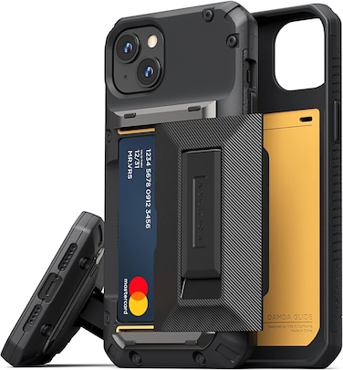VRS Design Damda Glide Hybrid case for Apple iPhone 14 Plus lets you access your cards in a flash via a Semi Automatic Sliding Back Compartment that can hold 3 to 4 cards or cash. The unique hybrid design features an Integrated Kickstand which is ergonomically designed to securely hold your phone while offering multiple viewing positions for your favorite entertainment. The Worlds first Semi Automatic Sliding mechanism (US Patent 9,661,116 B1) allows you to open the sliding compartment with a single push. The spring hinge mechanism immediately responds with a push, allowing users to access their essentials without difficulty. The card compartment with a recessed slot makes it easy to lift your cards when you need them.
