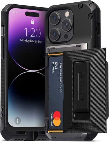 VRS Design Damda Glide Hybrid case for Apple iPhone 14 Pro lets you access your cards in a flash via a Semi Automatic Sliding Back Compartment that can hold 3 to 4 cards or cash. The unique hybrid design features an Integrated Kickstand which is ergonomically designed to securely hold your phone while offering multiple viewing positions for your favorite entertainment. The Worlds first Semi Automatic Sliding mechanism (US Patent 9,661,116 B1) allows you to open the sliding compartment with a single push. The spring hinge mechanism immediately responds with a push, allowing users to access their essentials without difficulty. The card compartment with a recessed slot makes it easy to lift your cards when you need them.