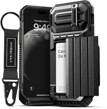 VRS Design Damda Glide Ultimate case for Apple iPhone 15 Pro Max lets you access your cards in a flash via a Semi-Automatic Sliding Back Compartment that can hold up to 4 cards OR cash. Seal your Camera from dust & scratches while on the move via the built-in semi auto hinge cover which also doubles as a Kickstand for hands free viewing with multiple angles in landscape mode.