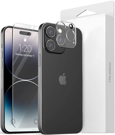 VRS Design First Glass Tempered Glass Screen Protector and Camera Lens Protector for Apple iPhone 14 Pro MAX are made with 9H hardness rated Tempered Glass for a safe and comfortable fit. Oleophobic coating prevents contaminants, making the glass easy to clean.