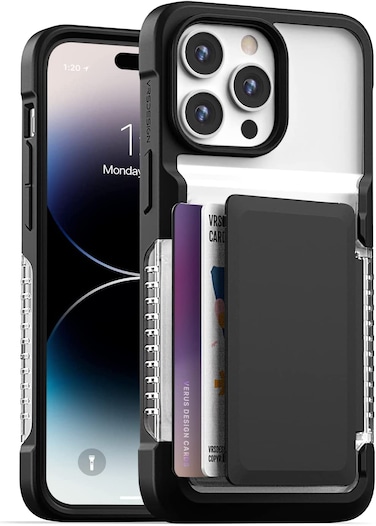 VRS Design Neo Flip case for Apple iPhone 14 Pro MAX lets you access your cards in a flash via an innovative Snap Open and Close mechanism door to access a compartment that can hold 2 cards or cash.