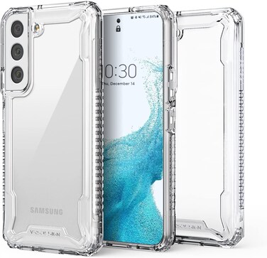 VRS Design Terra Guard Crystal case for Samsung Galaxy S22 offers impact protection with lasting clarity via a transparent Hard shell back panel fused on to a flexible textured TPU bumper for a great grip with style. The clear Terra Guard Crystal displays the original look and color of your device Drop Tested to meet VRS Standard Drop Protection and Shock Absorption. Raised Edges protect the outer front screen and camera from scratches when laid down on flat surfaces.