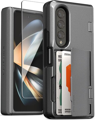 VRS Design Terra Guard Modern Go case for Samsung Galaxy Z Fold4 (2022) features an innovative 2 Card Holder compartment with door and Hinge Protection. The case offers complete Hinge coverage while opening and closing the Z Fold4 with first of its kind semi auto sliding technology. Terra Guard Modern Go is crafted to fit your device and offer everyday shockproof protection. It has raised edges around the screen and camera to protect against scratches and blemishes when laid down on flat surfaces. Enjoy the highly strong heavy duty protection of both sturdy PC back and impact-resistant TPU edge layers while looking sleek and modern with a luxurious finish all around.