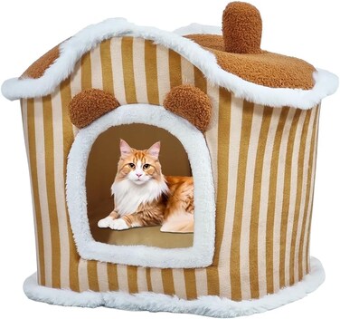 Pet bed house for medium and large cats, Comfortable cat house with Removable cushion and Anti-slip bottom, Detachable and machine washable cat house 60 cm (Brown)
