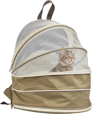 Cat carrier backpack, Breathable cat and small dogs backpack carrier with mat and safety leash, Expandable pet carrier bag for Travel, Hiking, and Outdoor use 48 cm (Beige)