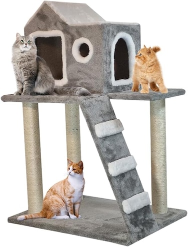 Cat Tree House is composed of good quality plush material, giving your cats a soft and comfortable touch in their estate. Nicely cushioned perch, spacious houses, sisal scratching posts provide a lot of fun to your kitties. They can watch birds and squirrels no the perches, take a nap in the condo, jump up and down, play with toys, or explore around in their castle. Solid construction with balanced design and strong base ensures your fur babies being safe as well as having fun from this cat stand. The cat climb in house Grey color will also match the furniture of your room. It will be a great tree for all size cats. Your cats will love their new castle.