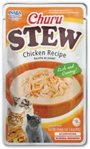 RICH & CREAMY: Churu Stew is a rich and creamy purée like our original Churu lickable cat treats, but with a thicker consistency that is perfect for serving as a side dish, plus we've added shreds of farm-raised chicken for added texture