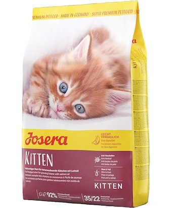 - Josera Kitten Cat Dry Food (400g) is its convenient and manageable size, perfect for feeding young kittens. Despite its smaller packaging, it offers a complete and balanced nutrition specifically formulated to support the rapid growth and development of kittens. This dry food includes high-quality ingredients such as poultry and salmon, providing essential proteins, fats, vitamins, and minerals necessary for healthy bones, muscles, and overall well-being during this crucial stage of life.
