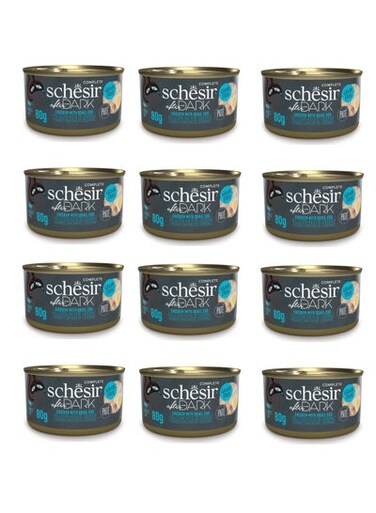 Complete and balanced wet food for adult cats Schesir After Dark is the range of minimally processed, complete and balanced wet foods with a high protein content, for cats who love the taste of meat and innards. A ground pâté full of protein, based on real chicken, together with tasty and nourishing chunks of heart, liver and gizzards and delicious quail eggs. 100% complete and balanced recipe, with all the proteins, vitamins and minerals your cat needs with real pieces of nutrient-rich hearts, livers and gizzards rich in protein, from real chicken and organs with real quail egg in tasty minced pate' rich in liquids, to provide the necessary hydration to the cat grain free minimally processed quality ingredients with high nutritional value Weight: 80g/ Can INGREDIENTS chicken 52% (gizzards 5%, livers 5%, hearts 5%), chicken broth 35%, quail egg 6%, refined sunflower oil, tapioca starch, egg powder, minerals. ADDITIVES taurine 500 mg, Fe (iron (II) sulphate monohydrate) 13.2 mg, Zn (zinc oxide) 22 mg, Mn (manganese (II) oxide) 4.5 mg, Cu (copper (II) chelate of glycine hydrate) 1.3 mg, I (potassium iodide) 0.9 mg, vit. D3 390 IU, choline chloride 610 mg, vit. B1 60 mg, vit. And 30 mg, vit. B3 30 mg, vit. At 19500 IU, vit. B7 0.3 mg, vit. B12 0.12 mg, vit. B5 3 mg, vit. B2 4.8 mg, vit. B6 2.4 mg, vit. B9 1.2 mg. ANALYTICAL COMPONENTS protein 12%, crude fat 2%, crude ash 2%, crude fiber 0.5%. Humidity 82%. Ca 0.19%, P 0.18%. ADVICE ON USE The indicated quantities refer to the administration of the complete wet product alone and may vary based on the specific needs of the animal. The quantities take into account the animal's daily nutritional requirements (related to weight, age, and lifestyle) and the characteristics of the food. Recommended doses: Weight : 4 kg 6 kg 8 kg Quantity : 3+1/2 per day 4+1/2 per day 5+1/2 per day *Serve at room temperature. Store in the refrigerator after opening and use within 48 hours.
