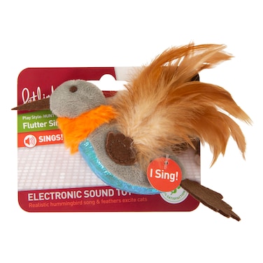 Petlinks® Flutter Singer™ Hummingbird Electronic Sound Cat Toy. With natural feathers, crinkle and felt this is sure to be your cat's favorite toy. Satisfy your cat's need to hunt with this realistically sized bird toy.