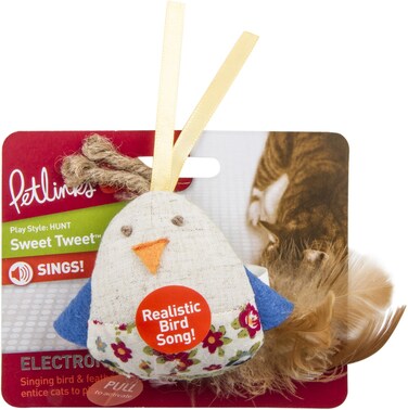 Chirping birds attract cats to prey in the garden, bring the thrill of the hunt inside with this new electronic sound toy. Petlinks® Sweet Tweet™, a ball sized bird, is cute as can be, with jute 'hair' and a feathered tail. This sweetie is a touch-activated electronic sound toy with catnip for added effect. Satisfy your cat's natural hunting instincts with this bat able sweet bird.