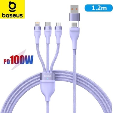 Baseus 100W Flash Series II Two-for-Three Fast Charging USB Type C Data Cable Compatible For iPhone 15/14/13/12/11 Series/MacBook/iPad/Samsung/Huawei And More 1.2 m Length, Purple