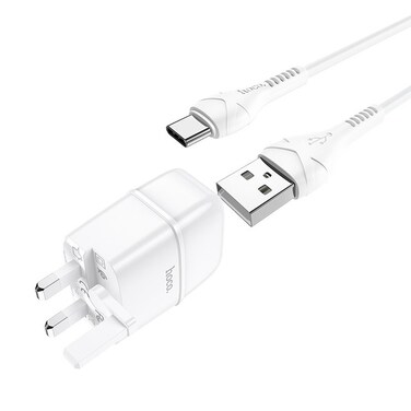 Hoco. Wall Charger - C77B Highway - Dual Port Charger UK Plug Set With Type-C Cable - White