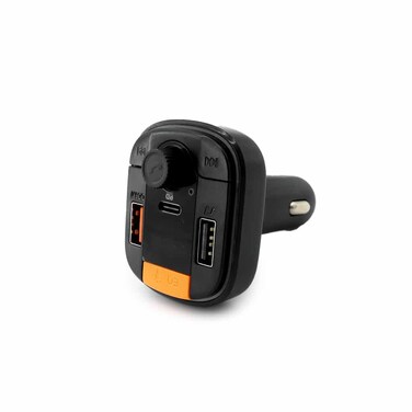 Wireless transmiter phone call & audio playing to the car FM stereo system via BT, Switch to Hands-free mode automatically from music playing status when receving phone call, Built-in Microphone, Incoming call number announcement, FM Frequency range:87.5MHz-108.OMHz, Input: DC12-24V, Output: PD/QC3.0(18w)+5v/A, Interface: USB-A +Type-C, Material: Pc/ABS,Metal