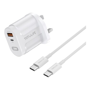 TotuLife PD Wall Charger White 20W with USB-C to USB-C Data Sync and Charging Cable White