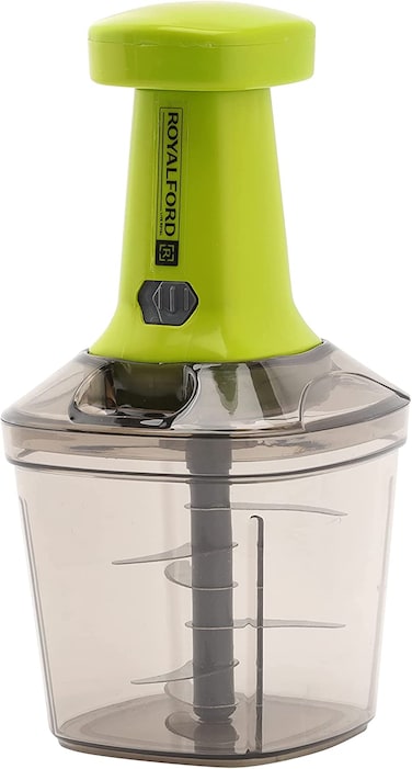 b'Save time in the kitchen with the Royalford quick hassle-free push chopper. This versatile and time-saving chopper is made from high-grade, food-safe, BPA-free material and is suitable for everyday use. The chopper has a large storage bowl with a capacity of 1000 ml and six super-sharp stainless steel blades for efficient and hassle-free chopping. The push chopper works without electricity, making it a must-have in your kitchen. The 6-tier blade set is made of premium-quality stainless steel that is corrosion resistant and does not bend easily. In addition, the blades are placed at different levels facing different directions for perfect dicing and chopping. The chopper is suitable for chopping onions, potatoes, carrots, garlic, cucumbers, and so on easily in a few seconds. The transparent body allows you to check the contents inside. The compact and innovatively designed chopper has a detachable body and lid, which makes it easy to wash and assemble. This multi-purpose chopper is portable and space-saving and is perfect for small kitchen spaces. The chopper is also quiet, safe to use, and perfect for gifting. The vibrant color, modern design and efficiency make it an attractive option. It comes in two coloursgreen and redmeasures 13.5x13.5x20.5cm in size, and weighs 0.385 kg.'