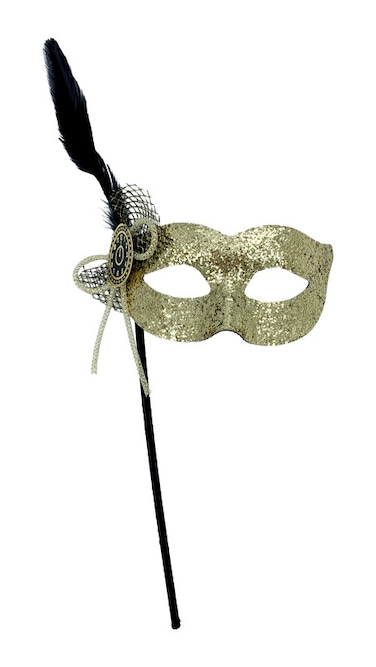 Gold glittered eye mask with stick. Perfect accessories for New Year party theme, mardi gras, etc….