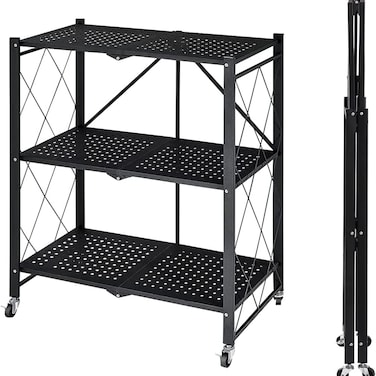 3 Tier Foldable Storage Shelf Unit with Wheel, Heavy Duty Storage Shelving Unit for Kitchen, Garage and Laundry Bathroom(black)
