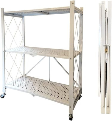 3 Tier Foldable Storage Shelf Unit with Wheel, Heavy Duty Storage Shelving Unit for Kitchen, Garage and Laundry Bathroom(white)