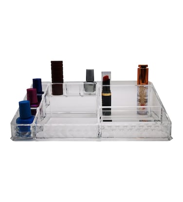 - • COSMETIC & MAKEUP STORAGE ORGANIZER - Organize all your beauty products, makeup and cosmetic accessories into the easy-to-use acrylic make up organizer. Enjoy a specious dazzling personalized beauty counter display. Find beauty in organization with the makeup organizer for vanity. • SLEEK & STYLISH - Cosmetics organizer with a chic beautiful transparent design creates a visually appealing display that coordinates with any style or existing décor - Its clear style creates easy visibility and appealing display- Great gift for any girl, teen, adult, beauty, fashion and makeup lover. • BEAUTIFULLY DISPLAY & ORGANIZE - Tired of rummaging through dresser drawers to find your favorite go-to items? The makeup drawer organizer will keep your makeup and accessories all in one place, neat and perfectly organized, and easily accessible - Reduce clutter, save time getting ready, and gain space. • FUNCTIONAL & CONVENIENT - Storage case fits on most dressers, vanity desks, and counter tops - Drawers are perfect for storing lipsticks, foundations, bronzers, blushes, eye shadows, primers, powders, skin care products etc. - Can also be used to store jewelry, personal accessories, grooming tools and much more. • DURABLE & LONG-LASTING - Made of durable clear plastic - Includes large drawers, small drawers, and black mesh padding inserts - Drawers slide open smoothly and handles are easy to grip.