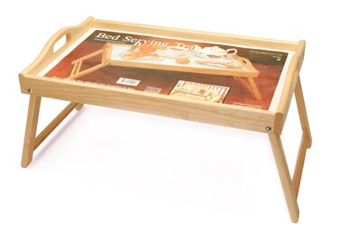 - This food serving tray is made of rubberwood. It's perfect as a breakfast in bed tray! The wooden serving tray comes with folding legs and comfortable handles for easy transport and storage. Our drink serving tray with legs features raised edges to keep spillage under control. This food tray for bed is also helpful as a side table for work or recreation. Carved handles for easy carrying. Great as a party serving tray. Foldable legs for easy storage. Made in Thailand. Dimensions: Standing: 56.5 x 35.5 x 25cm Folding: 56.5 x 35.5 x 8cm