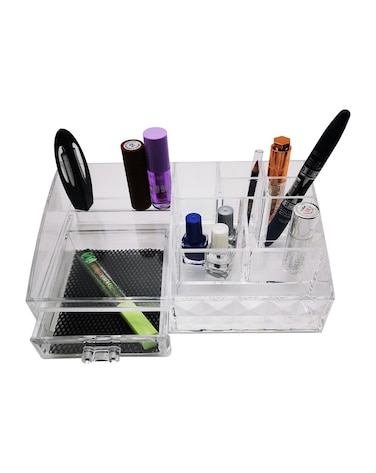 • •COSMETIC & MAKEUP STORAGE ORGANIZER - Organize all your beauty products, makeup and cosmetic accessories into the easy-to-use acrylic make up organizer. Enjoy a specious dazzling personalized beauty counter display. •SLEEK & STYLISH - Cosmetics organizer with a chic beautiful transparent design creates a visually appealing display that coordinates with any style or existing décor - Its clear style creates easy visibility and appealing display. •BEAUTIFULLY DISPLAY & ORGANIZE - Tired of rummaging through dresser drawers to find your favorite go-to items? The makeup drawer organizer will keep your makeup and accessories all in one place, neat and perfectly organized, and easily accessible. •FUNCTIONAL & CONVENIENT - Storage case fits on most dressers, vanity desks, and counter tops - Drawers are perfect for storing lipsticks, foundations, bronzers, blushes, eye shadows, primers, powders, skin care products etc. •DURABLE & LONG-LASTING - Made of durable clear plastic - Includes large drawers, small drawers, and black mesh padding inserts - Drawers slide open smoothly and handles are easy to grip.
