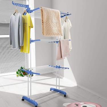 Clothes Drying Rack 3-Tiers with Retractable Trays, Collapsible Shelves, Rolling and Base with Casters, Stainless Laundry Dryer Indoor/Outdoor Standing Rack Blue