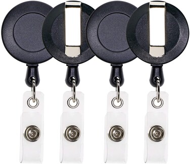 - <p>Reel diameter: 1.29 inches, 23.6 inches retractable cord length , Quantity:4 Pack.<p>Materials: good-quality plastic material and acrylic base, Black matte finish. The rounded edges of the clips will give you peace of mind that they will not cause damage to your clothing or any other personal items. Also won’t left any marks.<p>The metal belt clips make it a breeze to glide these reels onto spots, belts, seat belts, belt loops, pockets, clothing, scrubs neckline, waistline, neckline of dress, etc. They are light, sturdy, retract and easy to pull.<p>A perfect match for vinyl name tags with the snap-on clips makes it effortless to attach to the ID badge holder. Great choice for nurses, teachers, office staff, students, home, hospitals company and offices.<p>Color:Black, 4pcsThe matte finish on these reels is stylish on their own, but perfect if you want to add some personal flare! Embellish them with stickers, plastic jewels or even paint. The vinyl tag with the snap-on clips make it effortless to attach to an ID badge holder. The metal belt clips makes it a breeze to glide these reels on to belts, belt loops, pockets, etc. The rounded edges of the clips will give you peace of mind that they will not damage your clothing or any other personal items. These reels have a retractable cord length of 2.36 inches. This allows you to maintain your personal and private space.