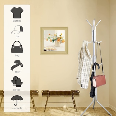- <p><li>Stylish & Simple Coat Rack This metal coat rack is designed in stylish and simple style, the bright polished paint and natural marble make it so generous. This luxury coat hanger can perfectly match with a variety of decoration styles. 12 hooks easily meet your daily hanging needs, just placed it at the door, beside the bed, in the living room, etc., create a more modern home.<p><li>Heavy Duty Construction & Stable Design features a stable steel triangular bases (0.8” width each leg) for keeping the balance to effectively support the weight of multiple allows you to hang small things you want. The stability that supports multiple over 22 lb.<p><li>Multipurpose Our freestanding coat hanger has 3 strong and sturdy mental prong legs, which make it can support multiple thick cloth items, it will not shake or tip over. 12 hooks allow you to hang several clothing items such as coats, jackets, ties and cardigans along with accessories like handbags, hats, laptop bags, scarves and umbrellas.<p><li>Easy Assembly The installation of this coat stand is very simple, follow the instructions, you can complete the installation in a few minutes, no tools are required. Just use soap and water and wipe dry. Great as a coat tree, hat rack, umbrella stand, clothes rack and much more. <p><li>Space Saver Keep your things and your guests’ items organized while saving space at the same time. With this product, keep things off the floor and off furniture and have it neatly hung.