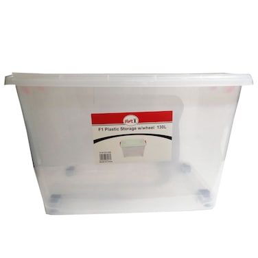 The First1 Plastic Storage Box With Wheel Clear 130L is a versatile and functional storage solution.