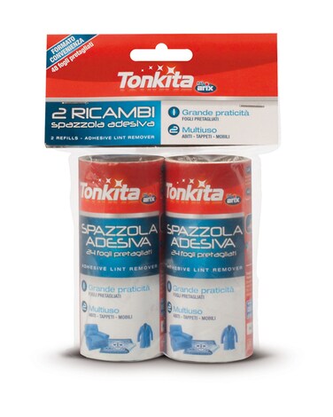 - Get rid of the unwanted fabric lint, hair, and dirt without any gummy deposit left behind with Tonkita Adhesive Roller Refill 2 Pieces Tk67. These adhesive roller refills are colorless and odorless. It is very simple to use them on different types of clothes, furniture, pets, sofa, carpet, and bed sheets, to name a few. Refills are specially designed to easy remove from the roller by tearing the paper sheets. You can carry them along while traveling, home, and even work.