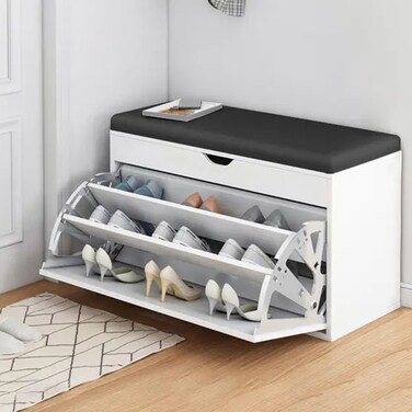 This tipping bucket shoe bench with handle ensures quick, easy access to your shoes and secure closing when rushing out the door.