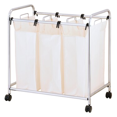 - Create an efficient system for organizing laundry with Zenments 3-bag heavy duty laundry sorter. From lights, darks, and colors to workout clothes, bedding, rugs and rags, the triple laundry sorter makes it easy to keep things separated and moving along in an orderly fashion. No need to create messy piles on the floor or to dig through mountains of laundry for a full load, hoping you didn't miss that favorite shirt on the bottom of the heap. The sorter offers at-a-glance convenience when it comes to monitoring when it's time to throw in a full load and having that pre-sorted load ready to go. The durable chromed steel frame supports large loads of laundry and heavy duty wheels are included for mobility. Dimension: 76.5Wx45.5Dx80H cm (≈30Wx18Dx32H inch). Material: Steel tube, wire & poly-cotton. Finish: Chrome plated. • Made in Taiwan • Machine-Washable Removable Bags: Includes three removable white poly-cotton sorting bins with metal handles for easy lifting. • Easy Sorting: Easily sort lights, darks, colors, delicates or dry-clean only in one efficient location. • Rolling Design & Sturdy Metal Frame: Conveniently wheel the large-capacity cart back and forth as needed. The cart has four sturdy casters - two are lockable and two roll freely. Tall handles make pushing the cart easy. Tubular steel construction for strength; sleek and easy-to-clean chrome plating. • Warranty:1-Year Limited Warranty