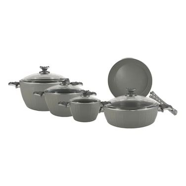 The Farah Ceramic Cookware Set in Grey includes 9 pieces that are perfect for all your cooking needs. The set is made with high-quality ceramic material that ensures even heat distribution for consistent cooking results.