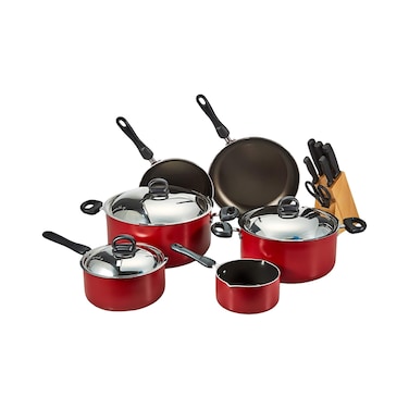 - Set includes: 2x 18cm saucepan with lid, 2x 24cm casserole with lid, 2x 28cm casserole with lid, 14cm milk pan, 22cm fry pan, 28cm fry pan, 7x knife block set
