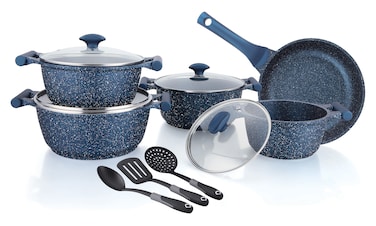 This set includes a variety of pots and pans, all made from durable cast aluminium with a non-stick granite coating. The blue colour adds a stylish touch to your kitchen decor.