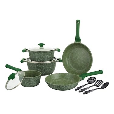 The Prestige Essentials Non-Stick Cookware Set in Green is a stylish and functional addition to any kitchen. This 11-piece set includes all the essential pots and pans needed for everyday cooking tasks.