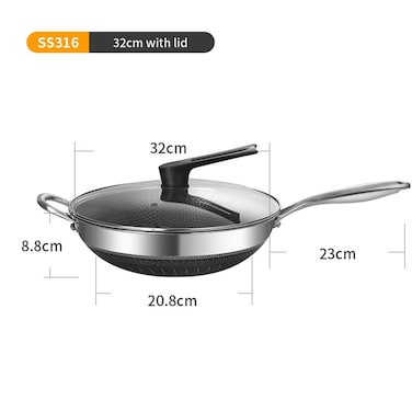 Quesera Stainless steel Non - stick , Honeycomb Fry Wok with Glass lid and Silicone Utensil Rest with Drip Pad 32CM