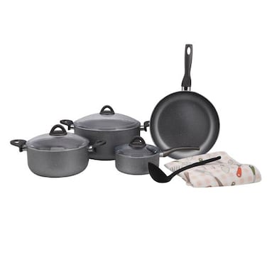 NON-STICK COATING, COMPACT LID - This 9Pcs Smart Granitium Cookware Set has a 5-layer granite coating and it has a tough glass lid with handles as these are easy to lift to see in the casserole to check while cooking the dish. Hard-anodized aluminium cookware is easy to clean with the granite coating surface with just a gentle wash with water. .