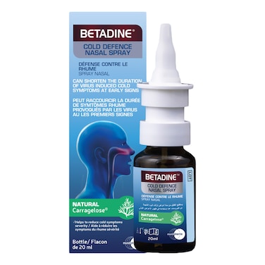 • <li>Short Description: <p><p>Fights Common Cold at early signs<p>Exhibits antiviral properties<p>Contains the natural ingredient CarrageloseTM that when used at early signs of symptoms it is clinically proven to:<p>Shorten the duration of common cold symptoms caused by viruses up to 2 days<p>Reduce the severity of symptoms<p>Reduce the relapse of viruses related symptoms of common cold virus<li>Large Description: <p>Betadine Cold Defense Nasal Spray is used for sustained moistening of the nasal mucosa, supporting the natural defense of the body against viruses and bacteria. A dry and irritated nasal mucosa may result from general air pollution or frequent stays in places with a low relative humidity such as heated or air-conditioned rooms, cars, trains and planes.<li>Benefits: <p><p> It can be used supportively for the treatment of common cold caused by viruses <p> Can shorten the duration and severity of common colds symptoms caused by viruses <p> It can reduce the resurgence of virus-related symptoms of common cold