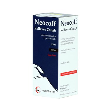 Neocoff 14 mg/5mL Syrup contains diphenhydramine hydrochloride BP which acts as an antitussiveand thus reduces coughing. In addition it has antihistaminic and anticholinergic action that produces a drying effect in the nose and chest. This formula is used for both adults and children over 12 years of age for relieving cough. Caution: May cause drowsiness. If affected, do not drive or operate machines. Avoid alcoholic drinks.