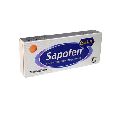 Sapofen Cold and Flu Tablets contains Ibuprofen and Pseudoephedrine hydrochlorothiazide that helps to provide relief from major cold and flu symptoms. Avoid driving or doing physical activity before taking the medicine.